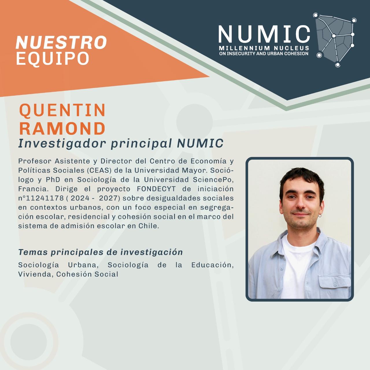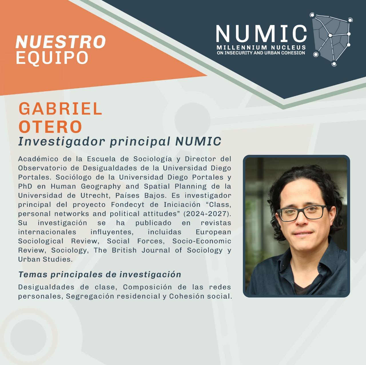 Asistente de investigación en NUMIC, Sociólogo (U. de Chile) y Magíster en Desarrollo Urbano (PUC). Especialista en desigualdad espacial, segregación y cohesión social, con experiencia previa en el COES y publicaciones en revistas como Urban Studies. Analiza cómo el entorno urbano y el barrio moldean los vínculos sociales.