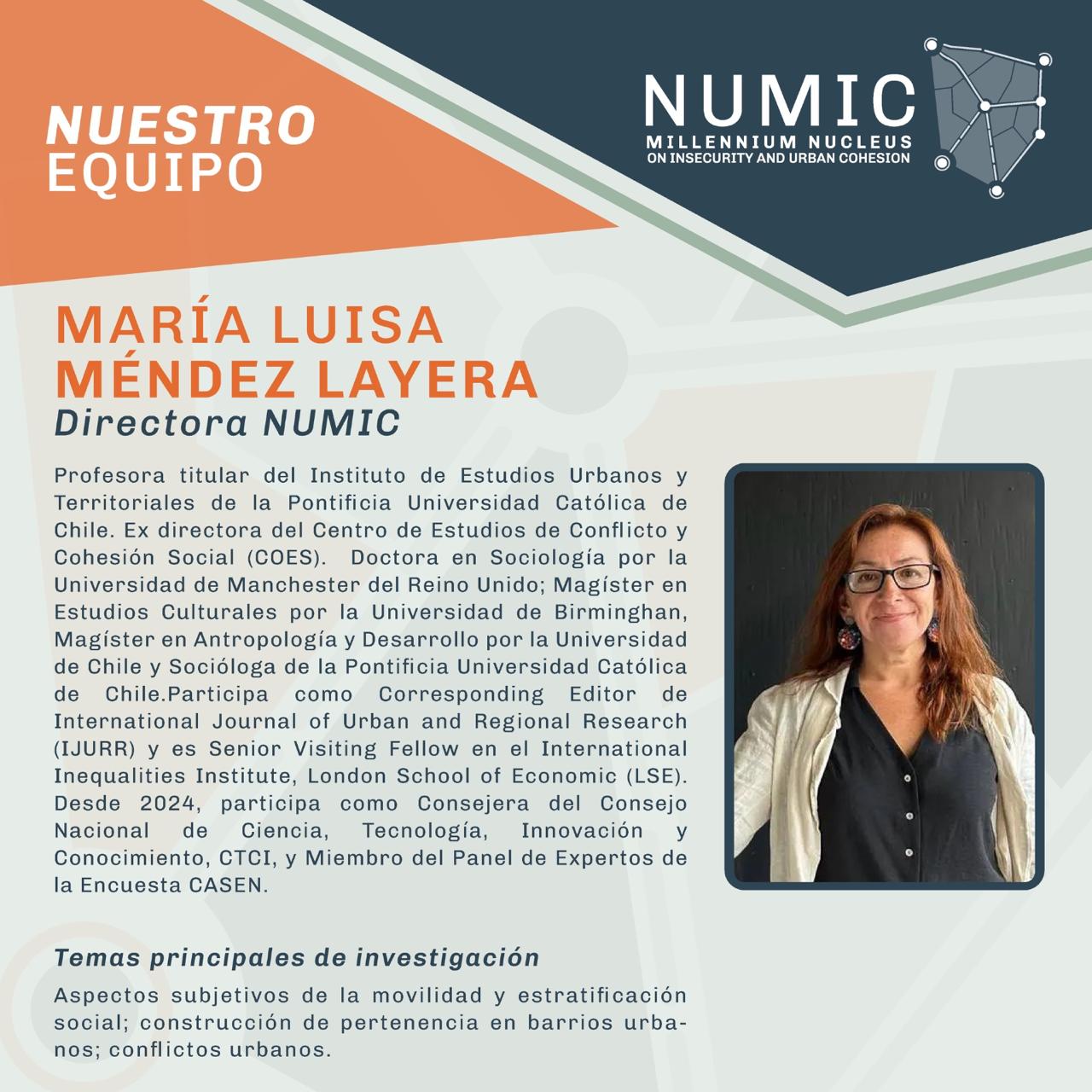 María Luisa Méndez Layera es Directora de NUMIC y Profesora Titular en la PUC. Doctora en Sociología (U. de Manchester), es experta en movilidad social, conflictos urbanos y consejera del CTCI, con una destacada trayectoria en investigación sobre estratificación y barrios.