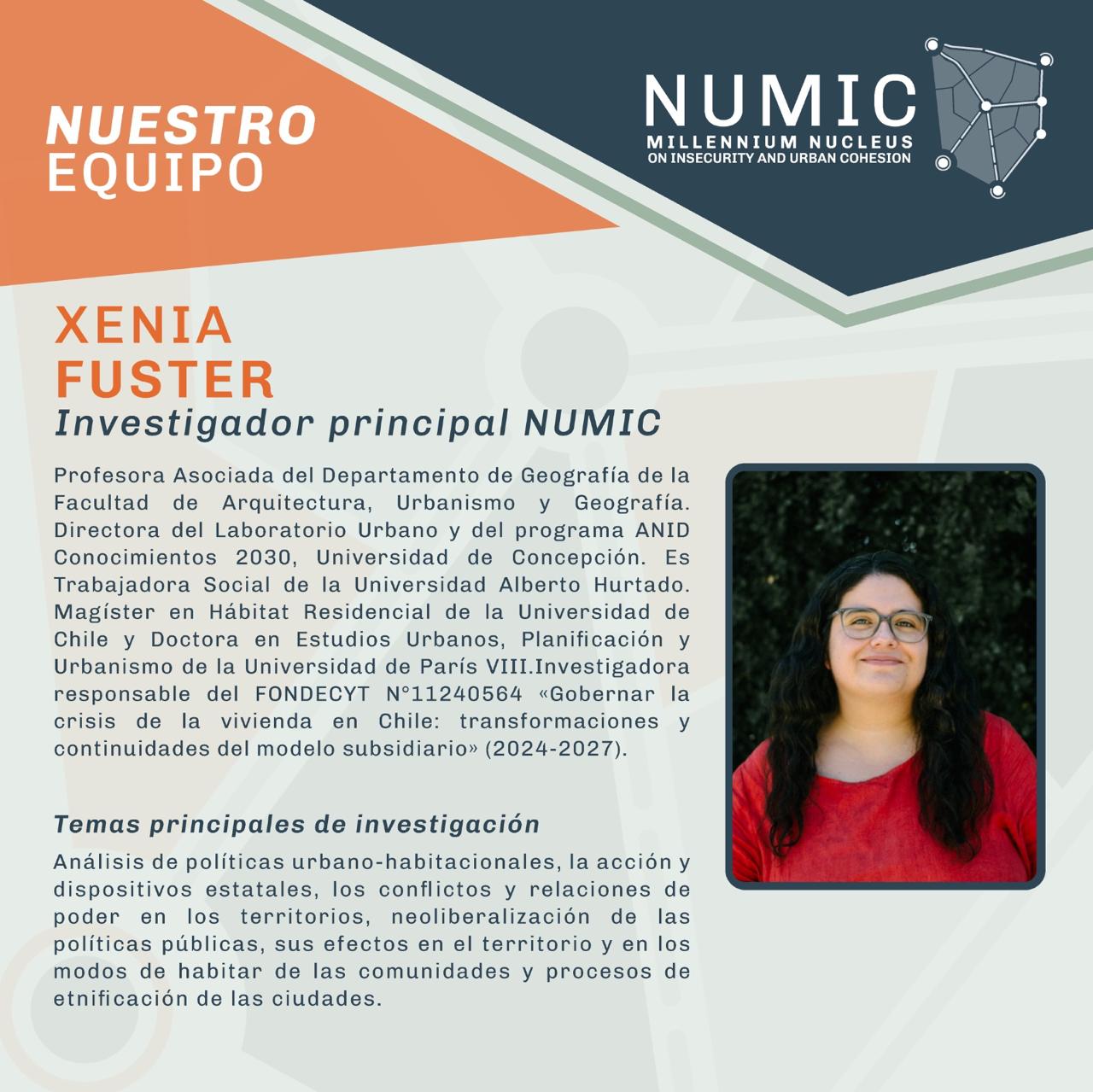 Asistente de investigación del Núcleo Milenio sobre Inseguridad y Cohesión Urbana (NUMIC) y Coordinadora de Investigación del Núcleo Milenio sobre los Desafíos Críticos de la Vivienda (NUVIV).