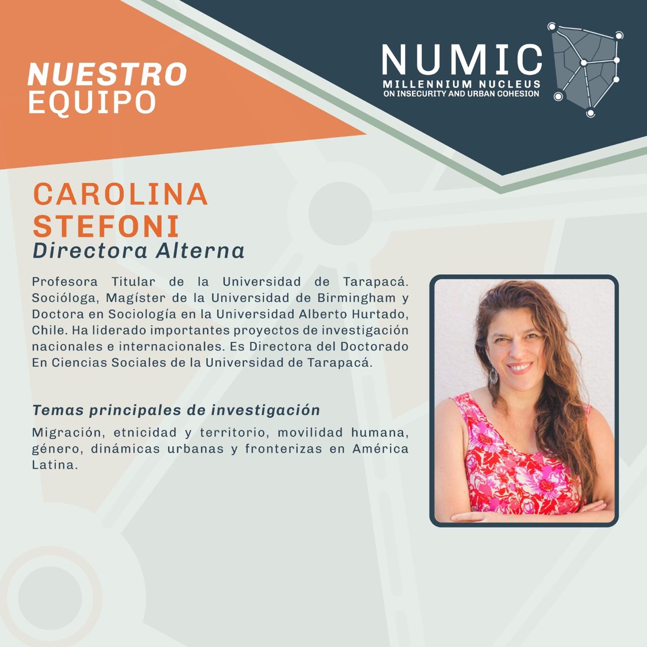 Directora Alterna de NUMIC y Profesora Titular de la Universidad de Tarapacá, donde dirige el Doctorado en Ciencias Sociales. Socióloga y Doctora en Sociología (U. Alberto Hurtado), es experta en migración, etnicidad, territorio y dinámicas fronterizas en América Latina.